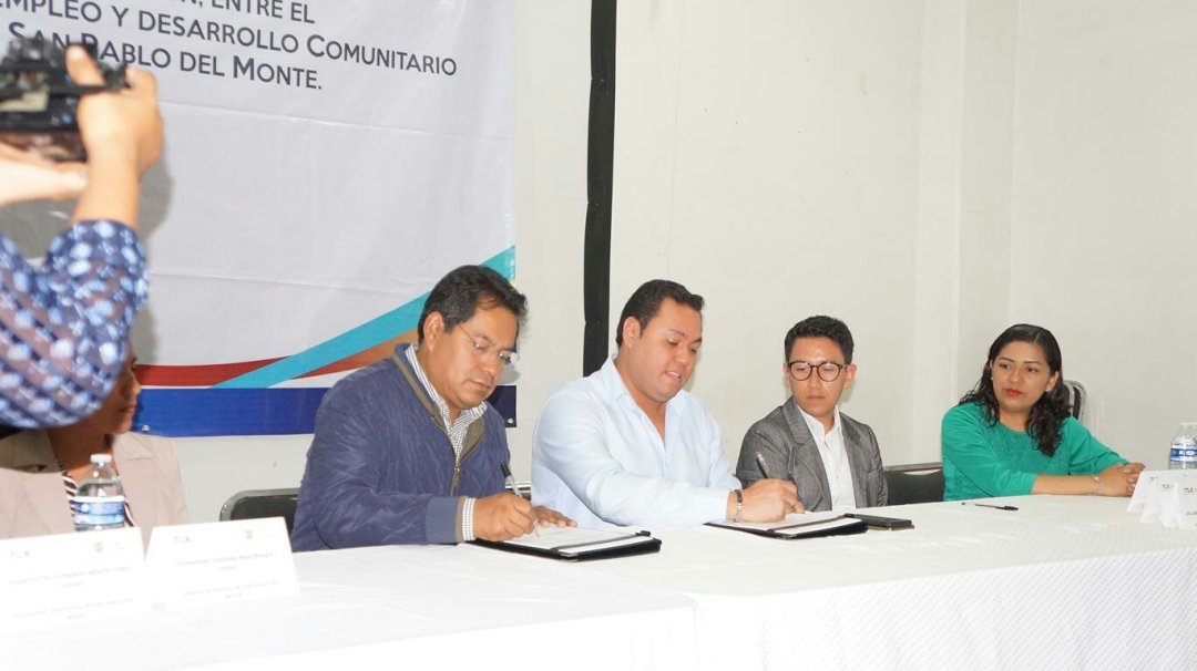 San Pablo del Monte, Tlax. – Edil municipal Cutberto B. Cano Coyotl firma convenio de colaboración con el Sistema Estatal de Promoción del Empleo y Desarrollo Comunitario del Estado de Tlaxcala (SEPUEDE) en el auditorio del Centro de Desarrollo Comunitario “Casa de Cultura” este martes 15 de Agosto.