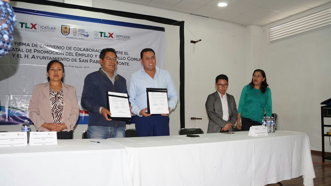 San Pablo del Monte, Tlax. – Edil municipal Cutberto B. Cano Coyotl firma convenio de colaboración con el Sistema Estatal de Promoción del Empleo y Desarrollo Comunitario del Estado de Tlaxcala (SEPUEDE) en el auditorio del Centro de Desarrollo Comunitario “Casa de Cultura” este martes 15 de Agosto.