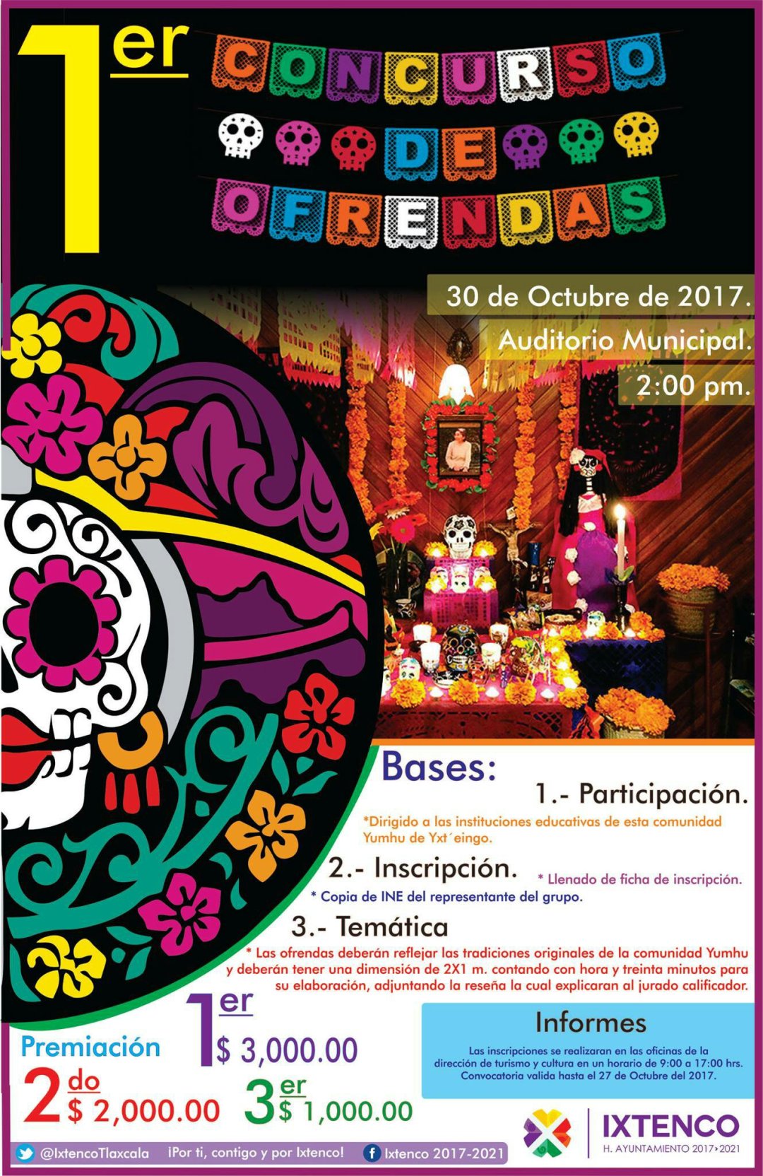 Con el objetivo de preservar y difundir las tradiciones y cultura, el Ayuntamiento que encabeza el Presidente Municipal de Ixtenco, Miguel Ángel Caballero Yonca, en coordinación con el área de Cultura y Turismo, convocan al primer concurso de ofrendas tradicionales para celebrar el día de muertos.