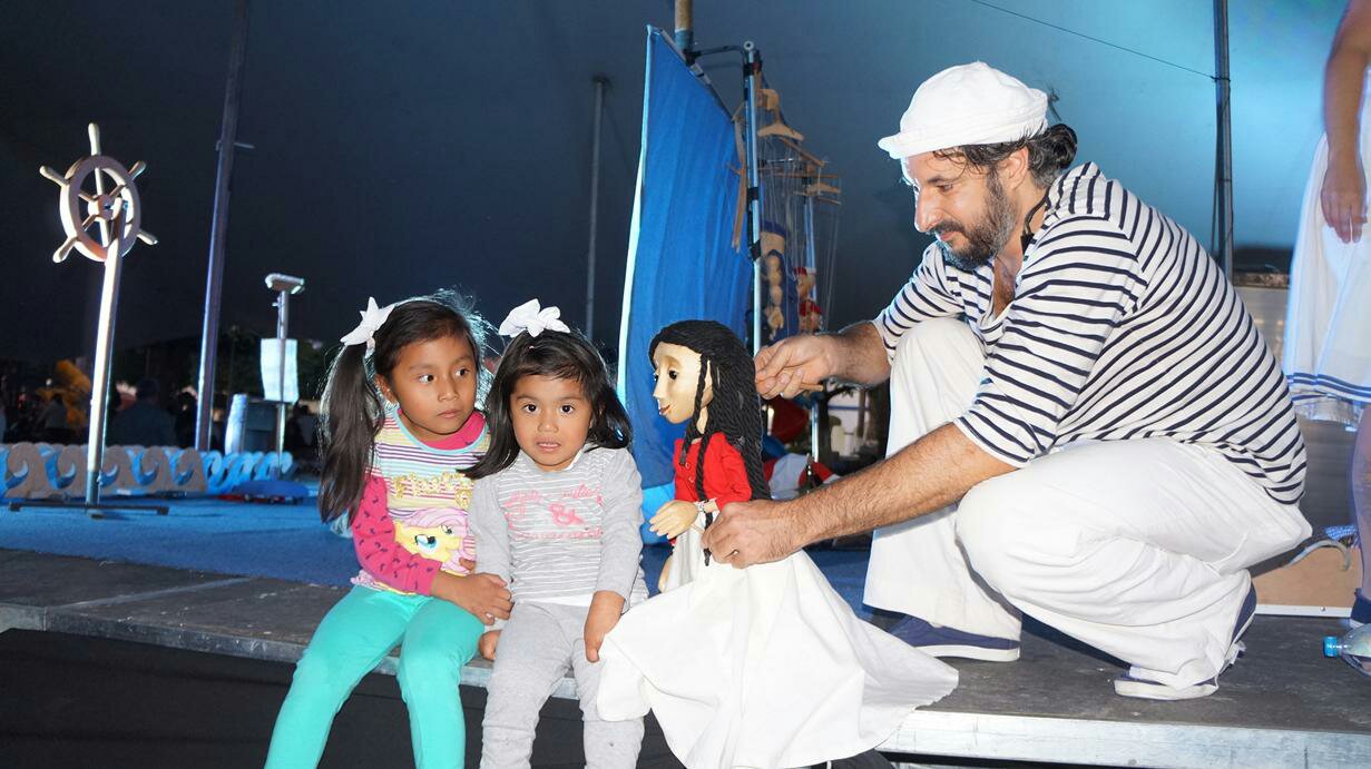 A partir de las 18:00 hrs. el trió de artistas titiriteros españoles hicieron acto de presencia en la plaza cívica del municipio para mostrar a los presentes la obra de tres comediantes que van de puerto en puerto explicando aventuras de mar.