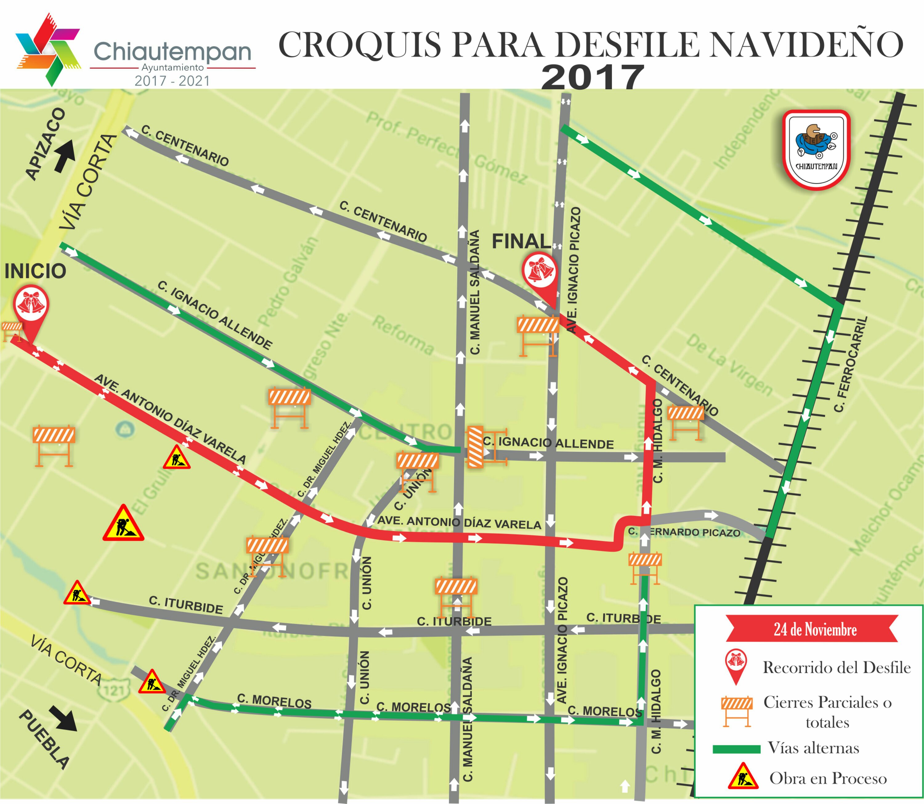 El Ayuntamiento de Chiautempan informó que este viernes 24 de noviembre, las principales calles del municipio serán cerradas de manera parcial y total con motivo del Desfile Navideño.