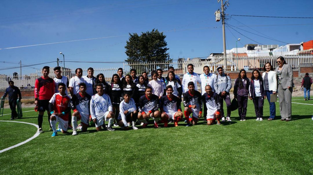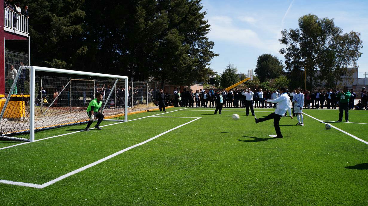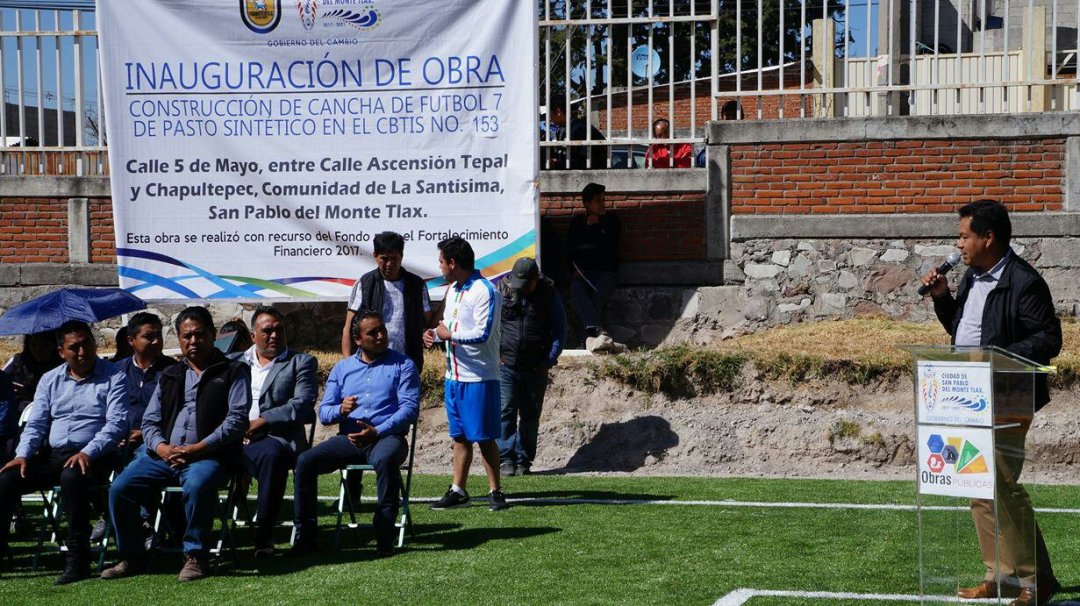 San Pablo del Monte, Tlax. – Ante un emotivo festejo por los 36 años de la fundación del Centro Bachilleratos Tecnológicos Industrial y de Servicio (CBTIS #153) este viernes 1 de diciembre; el presidente municipal Cutberto B. Cano Coyotl entrego la nueva cancha de futbol 7 a los directivos de esta institución.