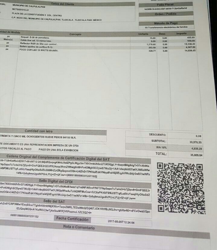 Esta ocasión, la fuente de información filtró las facturas por concepto de adquisición de focos, cable, soquet y otros productos por la cantidad de 57 mil 978 pesos en tres emisiones: una de ocho mil 925, otra de 13 mil 242 y la última de 35 mil 809 pesos.