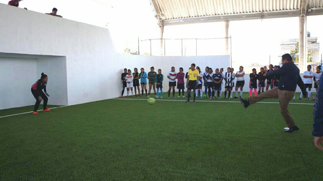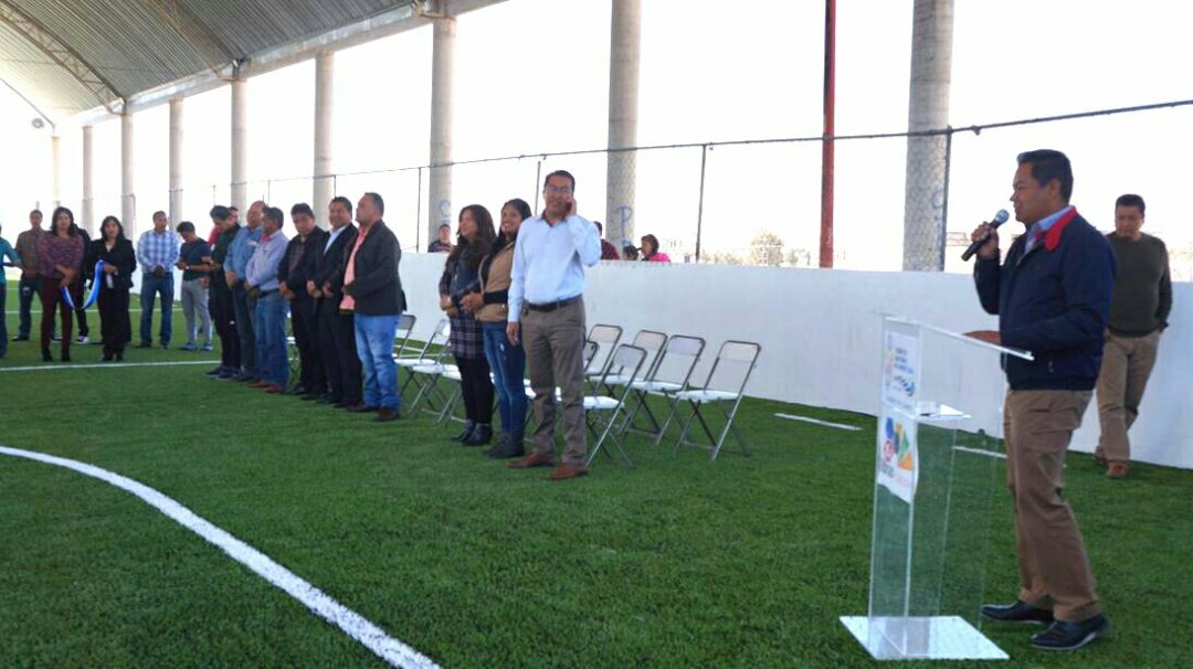 Estando presentes vecinos, deportistas, regidores y presidentes de comunidad así como funcionarios municipales; el edil entrego a las y los deportistas la rehabilitación de la techumbre y puesta de pasto sintético con un monto de inversión de 650 mil pesos, misma que servirá para atender a mas de 60 equipos del municipio que juegan durante toda la semana en estas instalaciones.