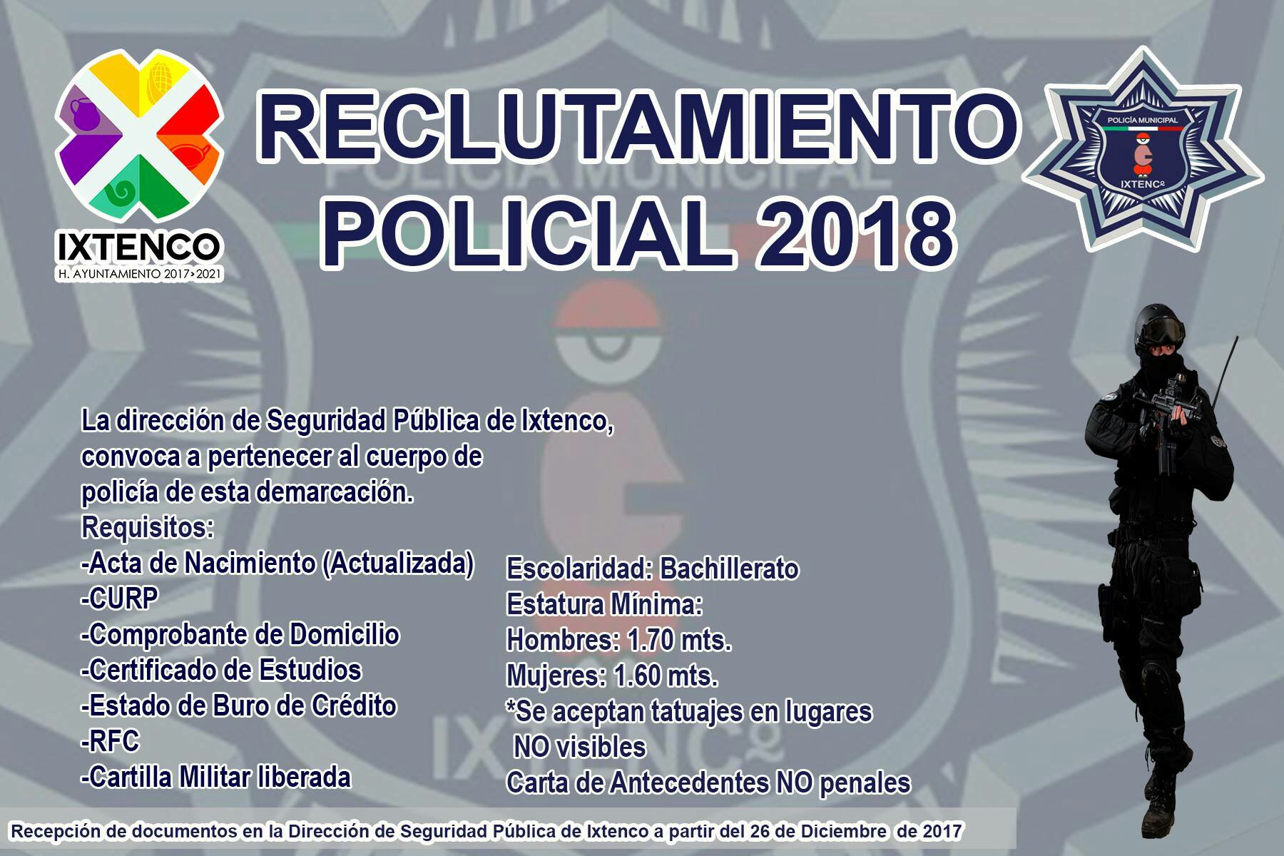 El Ayuntamiento de Ixtenco abrió desde el 26 de diciembre, la convocatoria para ingresar a la Policía Municipal, la cual está dirigida a mujeres y hombres que cuenten con vocación de servicio y un amplio compromiso social, informó el Presidente Municipal, Miguel Ángel Caballero Yonca.