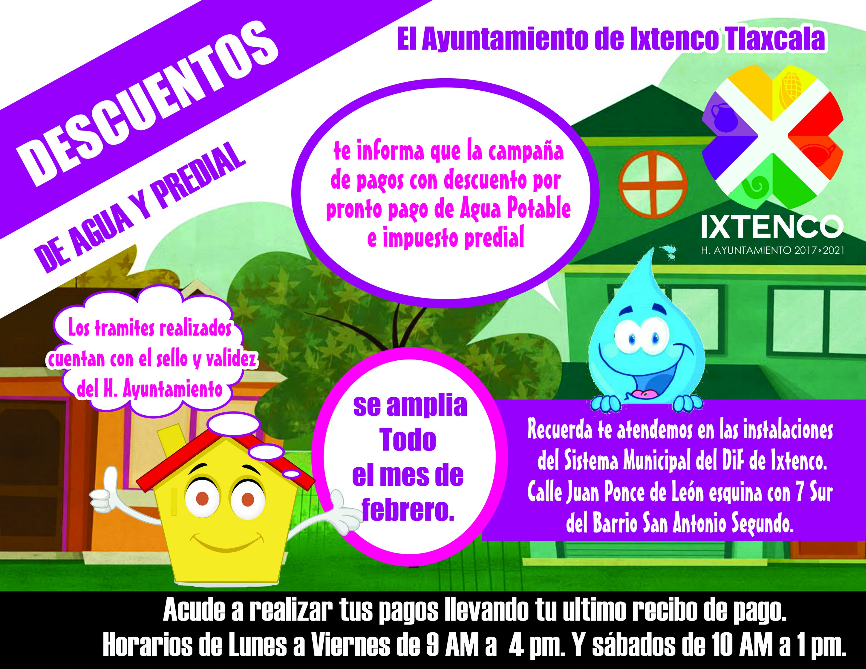Para continuar beneficiando a los contribuyentes que están acudiendo a hacer el pago de su Predial y los servicios de Agua Potable, el Presidente Municipal de Ixtenco Miguel Ángel Caballero Yonca, aprobó una ampliación de un mes más en la aplicación de descuentos, informó la tesorera municipal Miriam Patlani González.