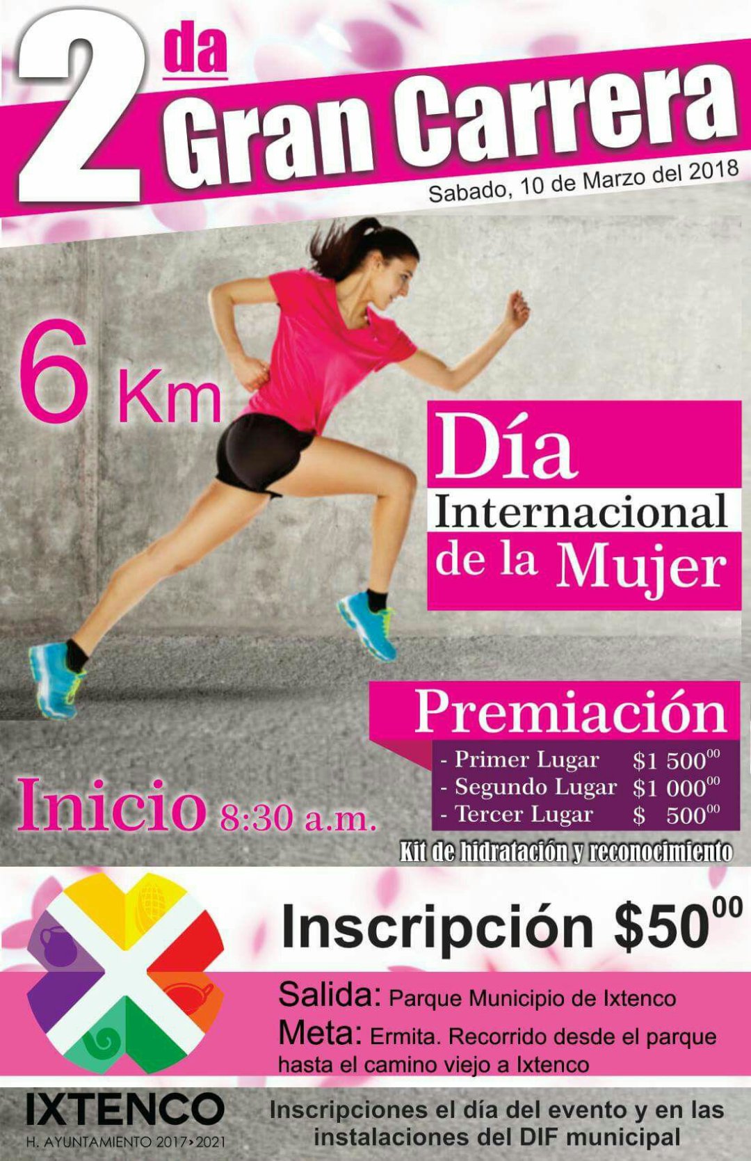 Con el objetivo de seguir impulsando el deporte en el Municipio de Ixtenco y conmemorar el día internacional de la mujer, el ayuntamiento que preside Miguel Ángel Caballero Yonca, convoca a la segunda edición de la carrera de la mujer.