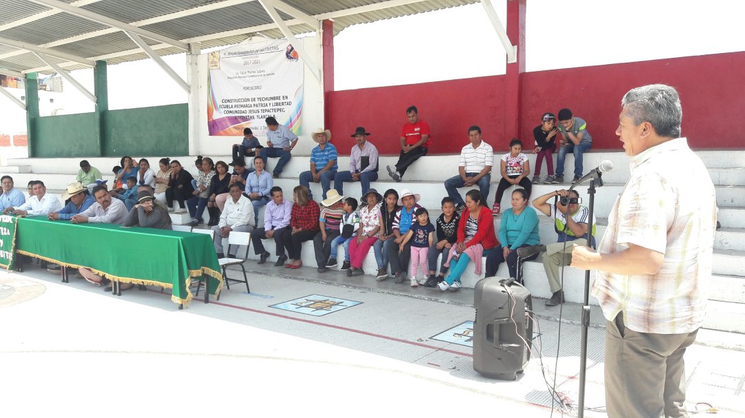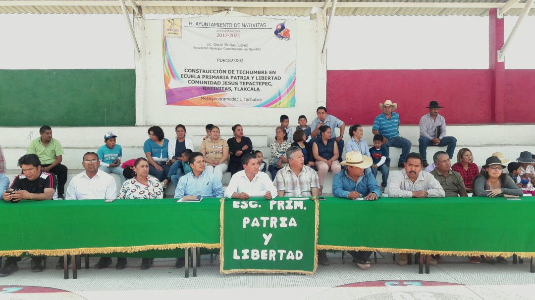 El alcalde de Natívitas, Óscar Murias Juárez y el diputado local, J Carmen Corona Pérez, dieron el banderazo de inicio de construcción de la techumbre en la escuela primaria Patria y Libertad, ubicada en la comunidad de Jesús Tepactepec.
