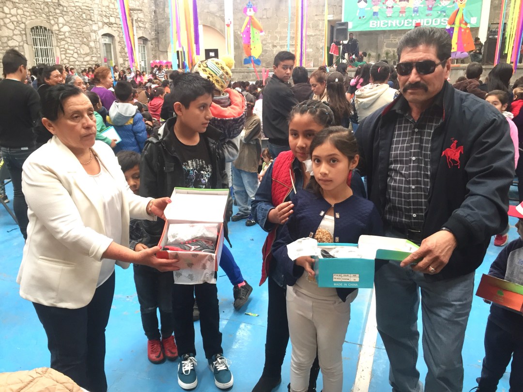 El alcalde acompañado de su esposa, Estela Pérez Ruiz, entregó zapatos a decenas de niños en su día, mismos que agradecieron el gesto de las autoridades.