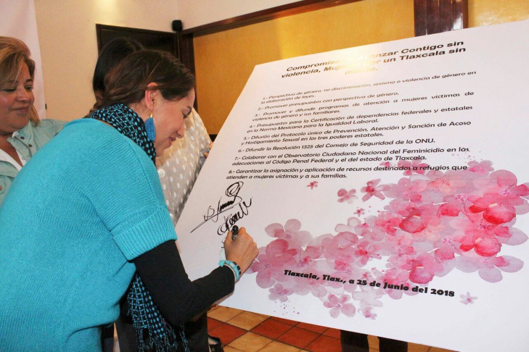 Los compromisos firmados fueron: Perspectiva de género, no discriminación, sexismo o violencia de género en leyes; Promover presupuestos con perspectiva de género; Promover y difundir programas de atención a mujeres víctimas de violencia de género y sus familiares; Presupuestos para la Certificación de dependencias federales y estatales en la Norma Mexicana para la Igualdad Laboral; Difusión del Protocolo Único de Prevención, Atención y Sanción de Acoso y Hostigamiento Sexual en los tres poderes estatales.