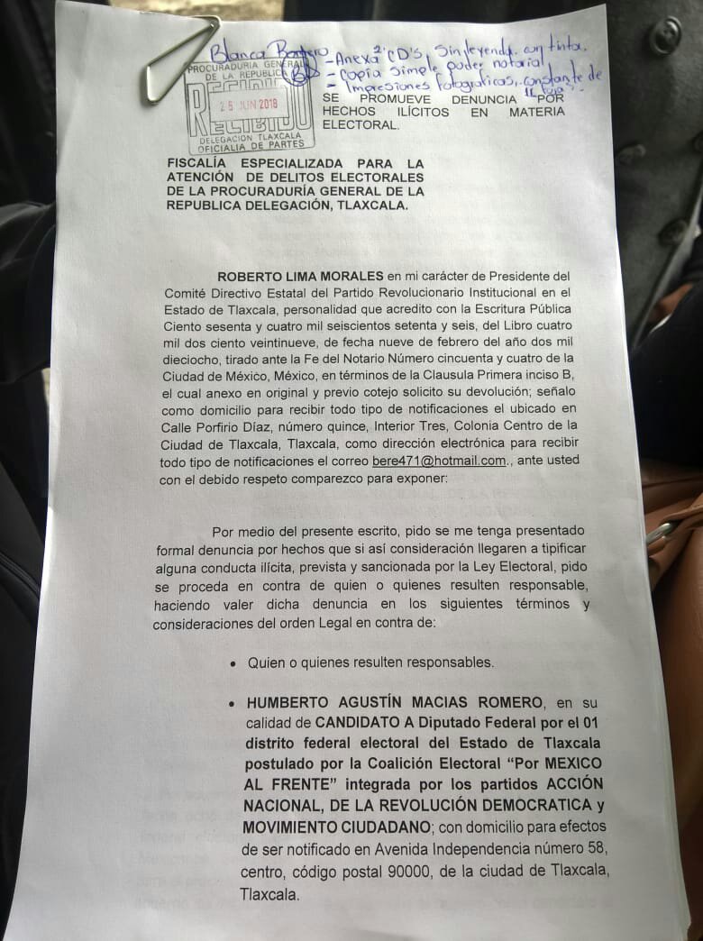 Tras considerar que se violentó el principio de equidad y se trasgredieron las normas electorales, el Comité Directivo Estatal (CDE) del Partido Revolucionario Institucional (PRI), presentó una denuncia ante la Fiscalía Especializada para la Atención de Delitos Electorales (FEPADE) en contra de autoridades y personal del Ayuntamiento de Apizaco.