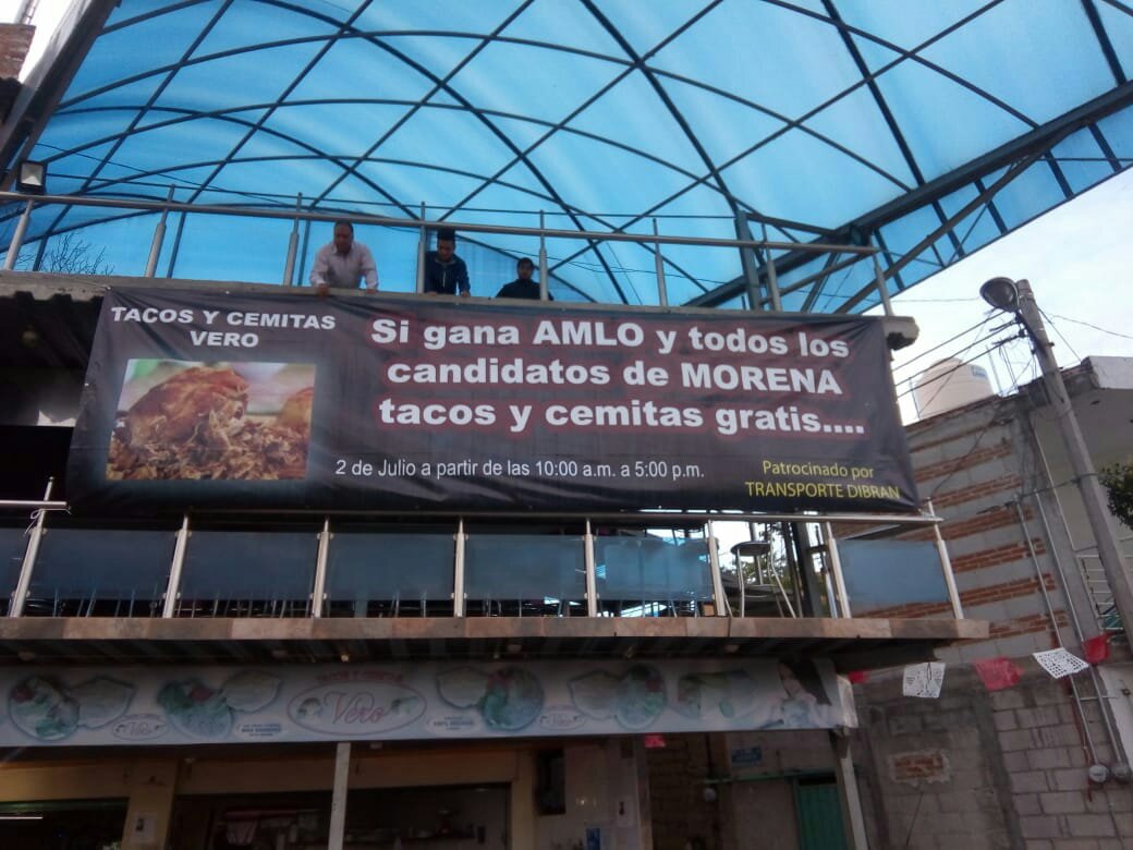 Tal como se ha hecho en otros comercios a nivel nacional, una taquería ubicada en el municipio de Mazatecochco, promete que si gana Andrés Manuel López Obrador y sus candidatos en Tlaxcala, regalará sus productos al público.