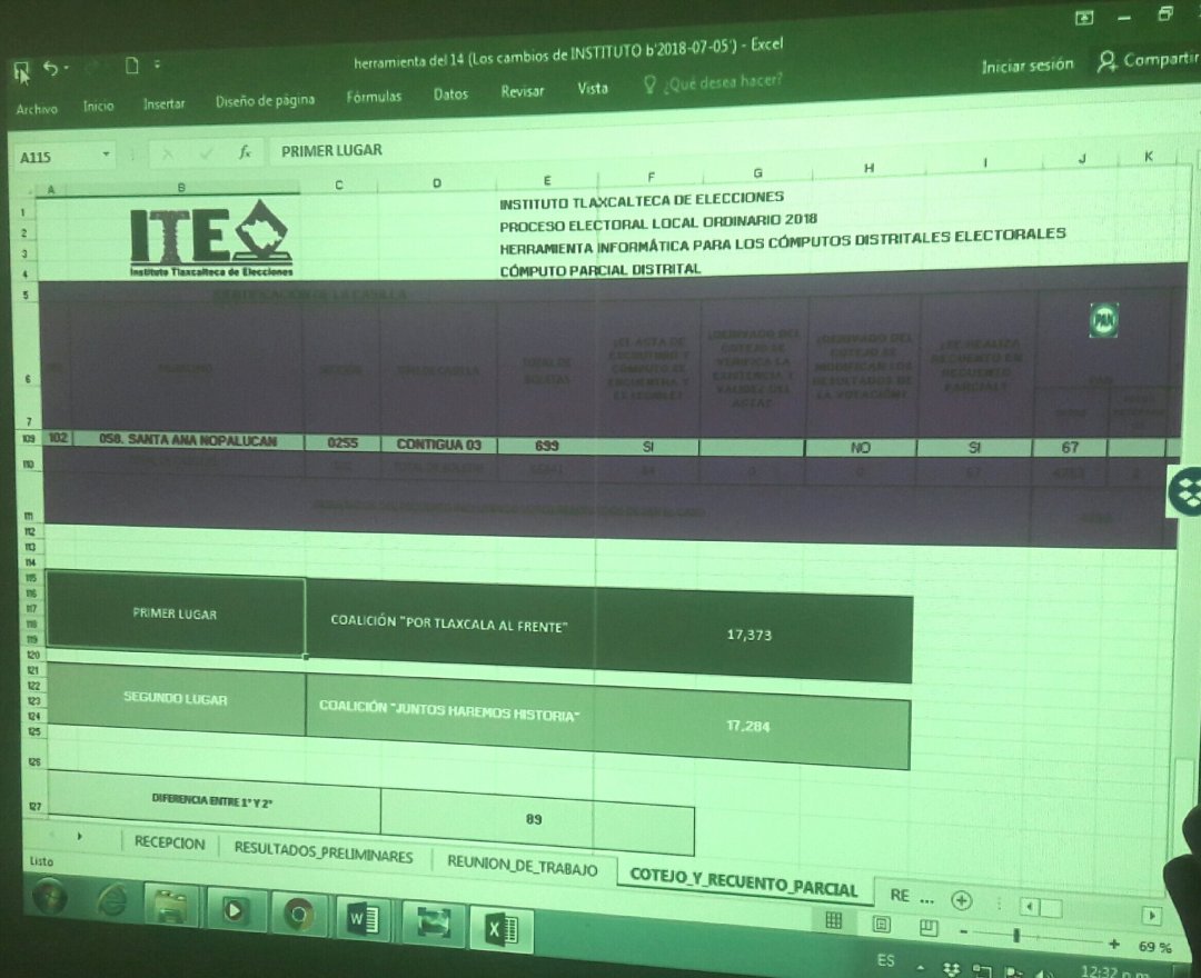 El cotejo y recuento parcial de 102 paquetes electorales dieron una mínima ventaja de 89 votos a la coalición Por Tlaxcala al Frente que encabeza Miguel Ángel Covarrubias en el distrito XIV, por lo que el Consejo Distrital determinó abrir 37 urnas para dar certidumbre.