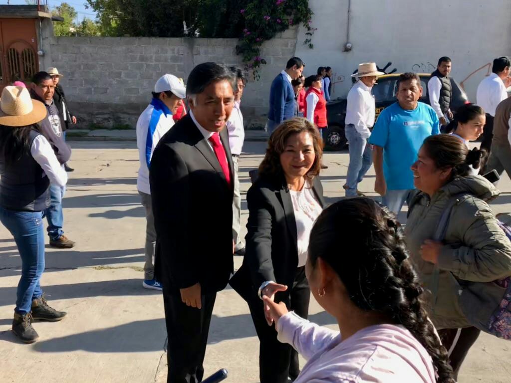 El alcalde y su esposa, María Asunción Coyotzi Cahuantzi, saludaron a los pobladores que salían a presenciar la colocación de los Bandos Solemnes de Fiestas Patrias.