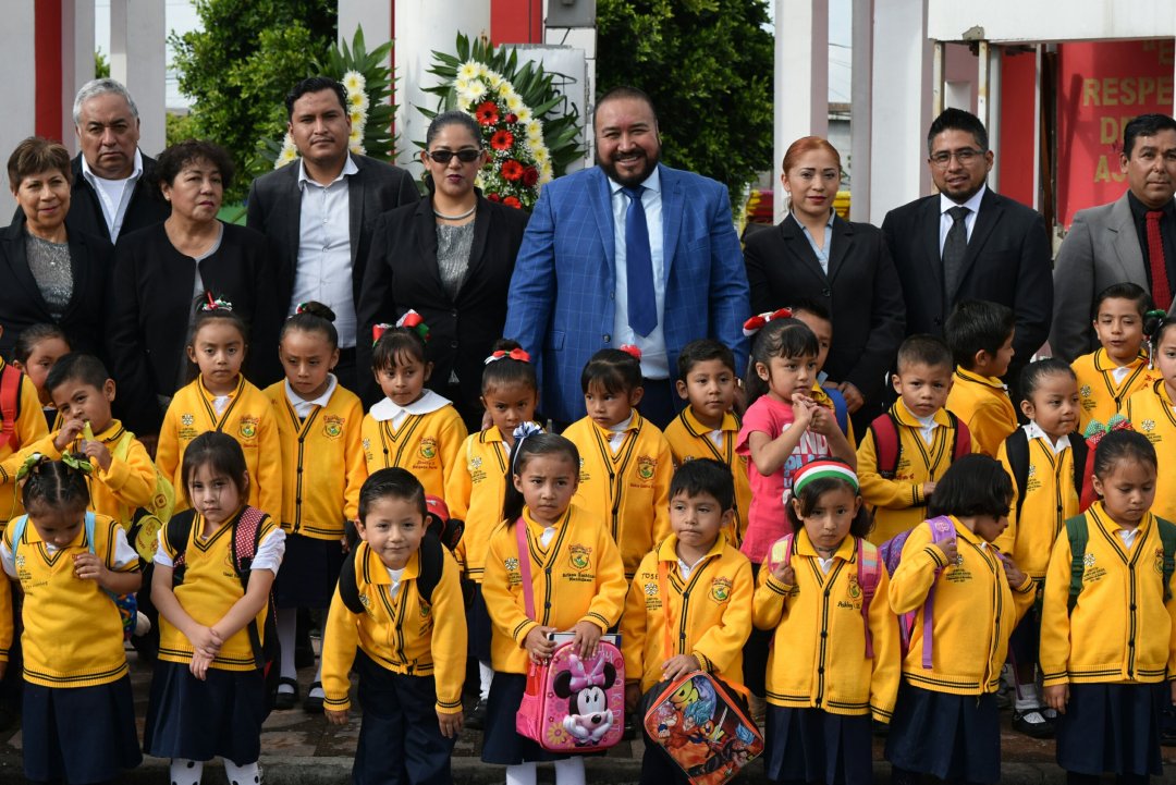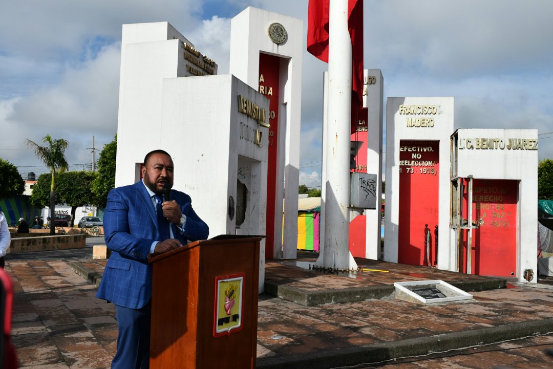 Acompañado por integrantes de su cabildo, personal administrativo, así como alumnos y personal docente de la Escuela Primaria “Mártires de Xicohtzinco”, realizó el memorable homenaje.