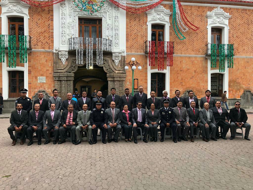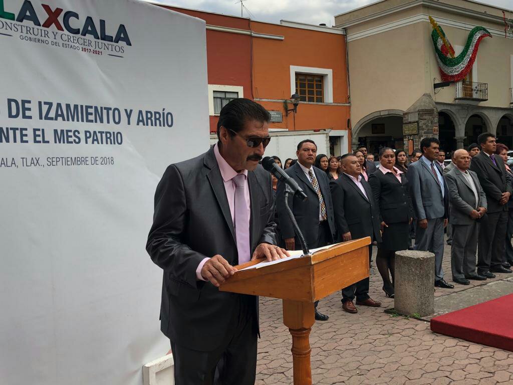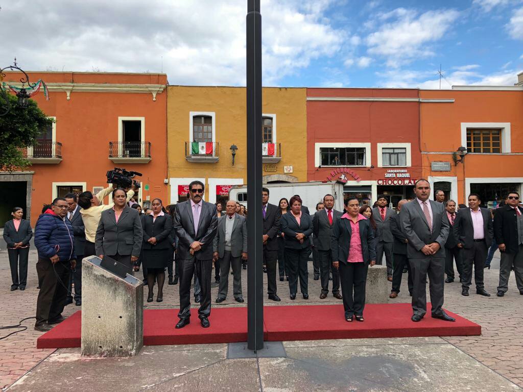 El alcalde de Xaltocan, Eugenio Sánchez Amador, acompañado por integrantes de su cabildo, así como personal administrativo, encabezó la ceremonia de arrío de Bandera en la capital de Tlaxcala.