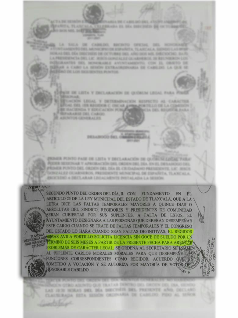 Con la finalidad de brindar todas las facilidades a las autoridades competentes y sean éstas las que determinen su situación legal con base a las acusaciones de las que ha sido objeto, el regidor de Españita, Oscar Avila Portillo, solicitó licencia al cargo por seis meses sin goce de sueldo.