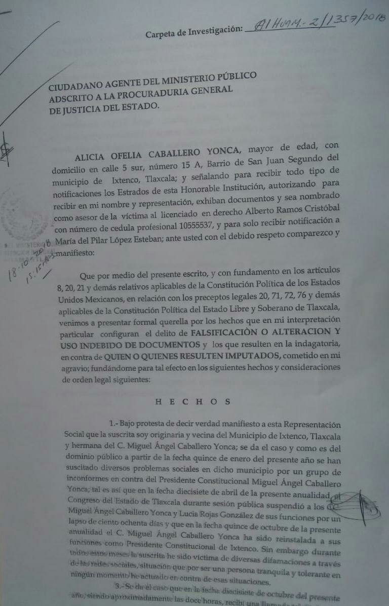 Este día, Alicia Caballero Yonca, denunció ante las autoridades correspondientes falsificación o alteración y uso indebido de documentos, pues el grupo que se autodenominó, pacífico, ha dado a conocer en redes sociales una serie de nóminas, en donde específicamente ella percibía supuestamente en la nómina de Ixtenco, ingresos de hasta 35 mil pesos mensuales como asesor jurídico de dicho ayuntamiento, sin embargo este día acudió a la agencia del ministerio público a denunciar en contra de quienes resulten imputados de los agravios en su contra.