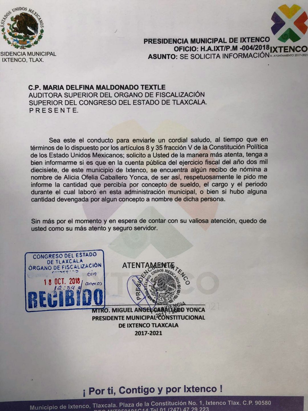 Asimismo para verificar la información y deslindarse de las acusaciones en su contra, se solicitó a la Auditoria Superior del Órgano de Fiscalización, María Delfina Maldonado Textle verifique si en la cuenta fiscal correspondiente al año 2017 de Ixtenco, se encuentra algún recibo de nómina a nombre de la denunciante o bien su existe alguna cantidad devengada a nombre de Alicia Caballero.