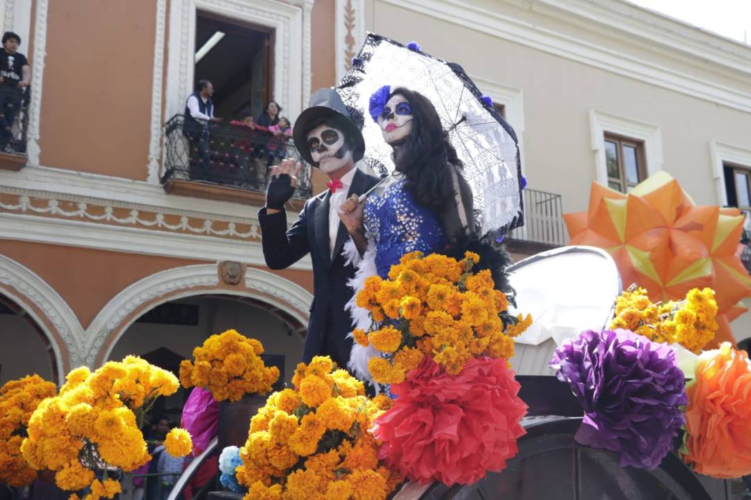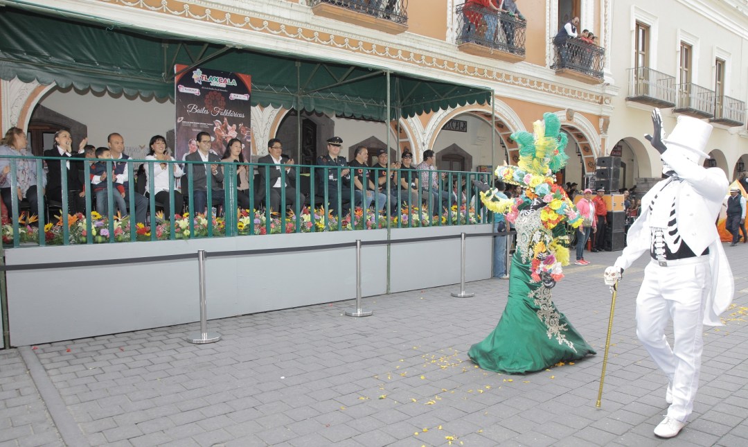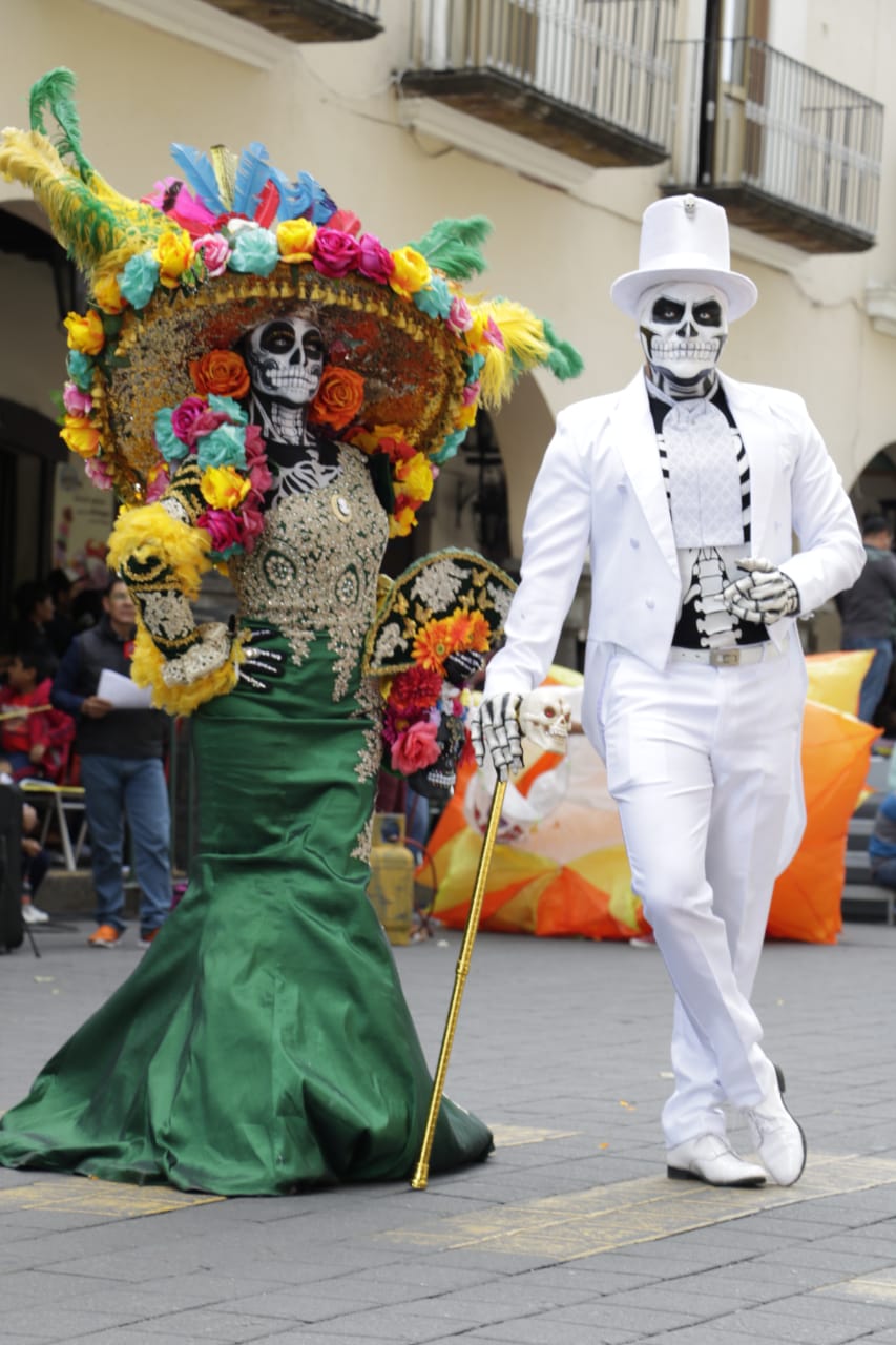 En esta edición, las familias tlaxcaltecas y visitantes apreciaron un colorido desfile, en el que se resaltaron disfraces como el de la tradicional catrina y títeres de calaveras.
