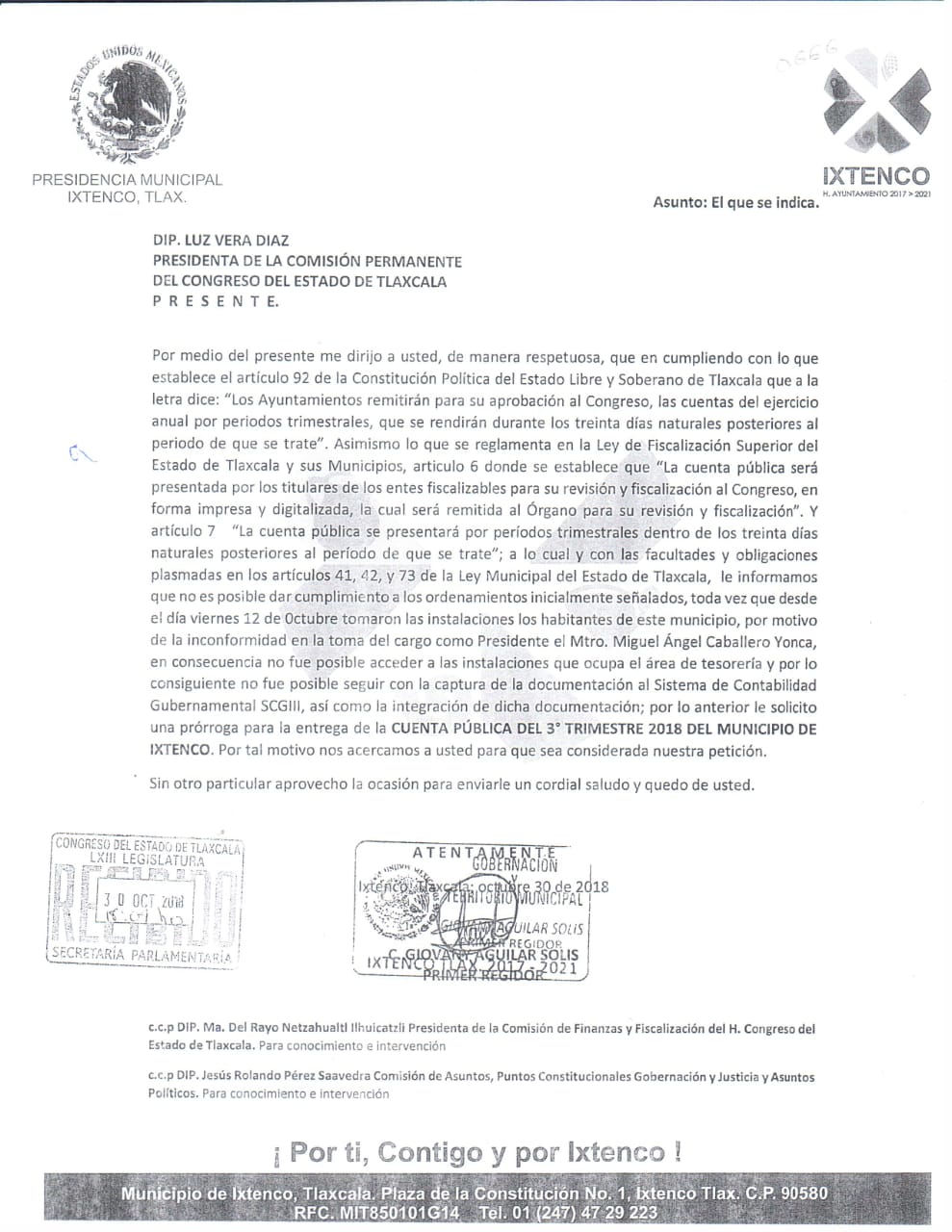 En una misiva enviada al congreso local de Tlaxcala, el regidor Giovanni Aguilar, quien asumió funciones de alcalde en Ixtenco por 6 meses, culpó al grupo del movimiento pacífico, a quienes señaló de manera directa, como los causantes en el retraso en la entrega de su cuenta pública del segundo trimestre.