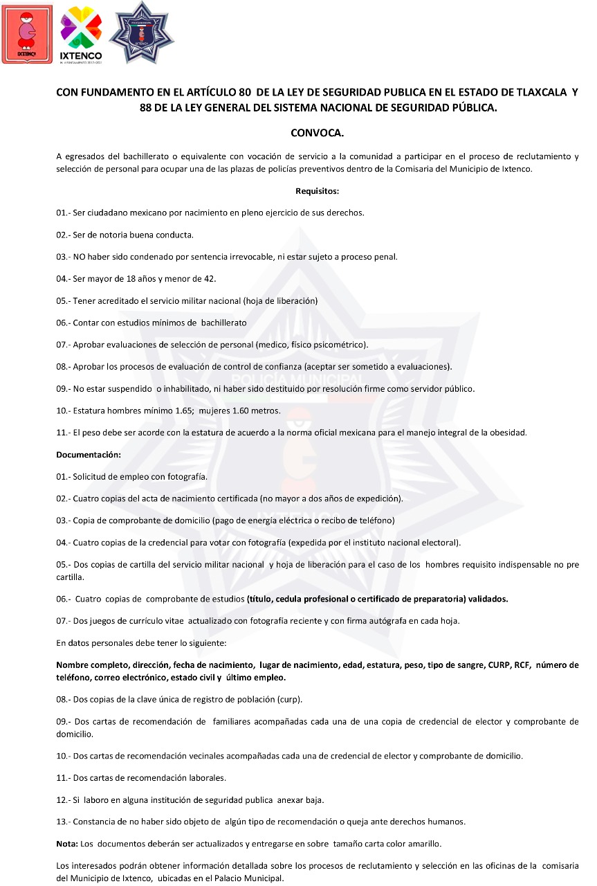 Este día, la Dirección de Seguridad Pública del Municipio de Ixtenco, lanzó la convocatoria de reclutamiento para el puesto de oficial preventivo y así pertenecer a las fuerzas municipales.