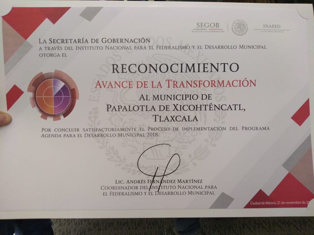 La Secretaría de Gobernación (Segob) a través del Instituto Nacional para el Federalismo y el Desarrollo Municipal (Inafed) realizó la entrega de un reconocimiento al municipio de Papalotla por participar por segundo año consecutivo en el Programa Agenda para el Desarrollo Municipal, que tiene por objetivo construir gobiernos eficientes y eficaces.