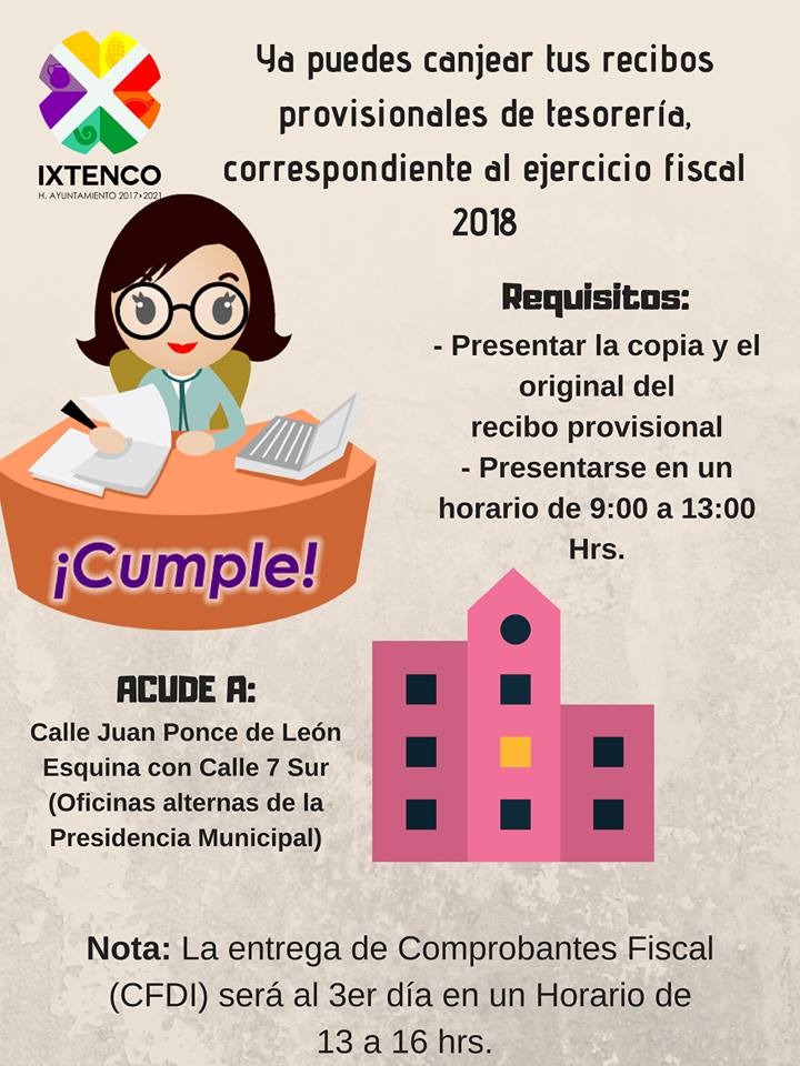 El Ayuntamiento de Ixtenco, a través del área de tesorería Municipal, informó que continúan con el canje de Recibos provisionales correspondiente al ejercicio fiscal 2018.