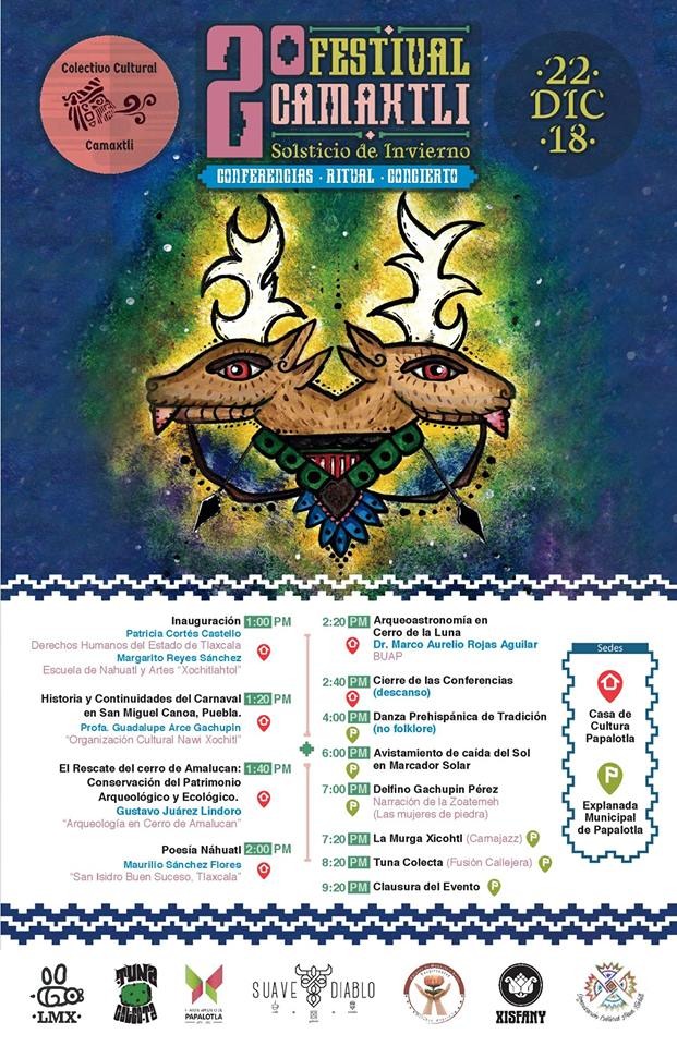 Se trata del Segundo Festival Camaxtli “Solsticio de Invierno”, que es uno de los más importantes organizados por esta agrupación, mismo que contempla; conferencias sobre la historia del carnaval de Canoa, poesía náhuatl, danzas prehispánicas, entre otras actividades a partir de las 13:00 horas.
