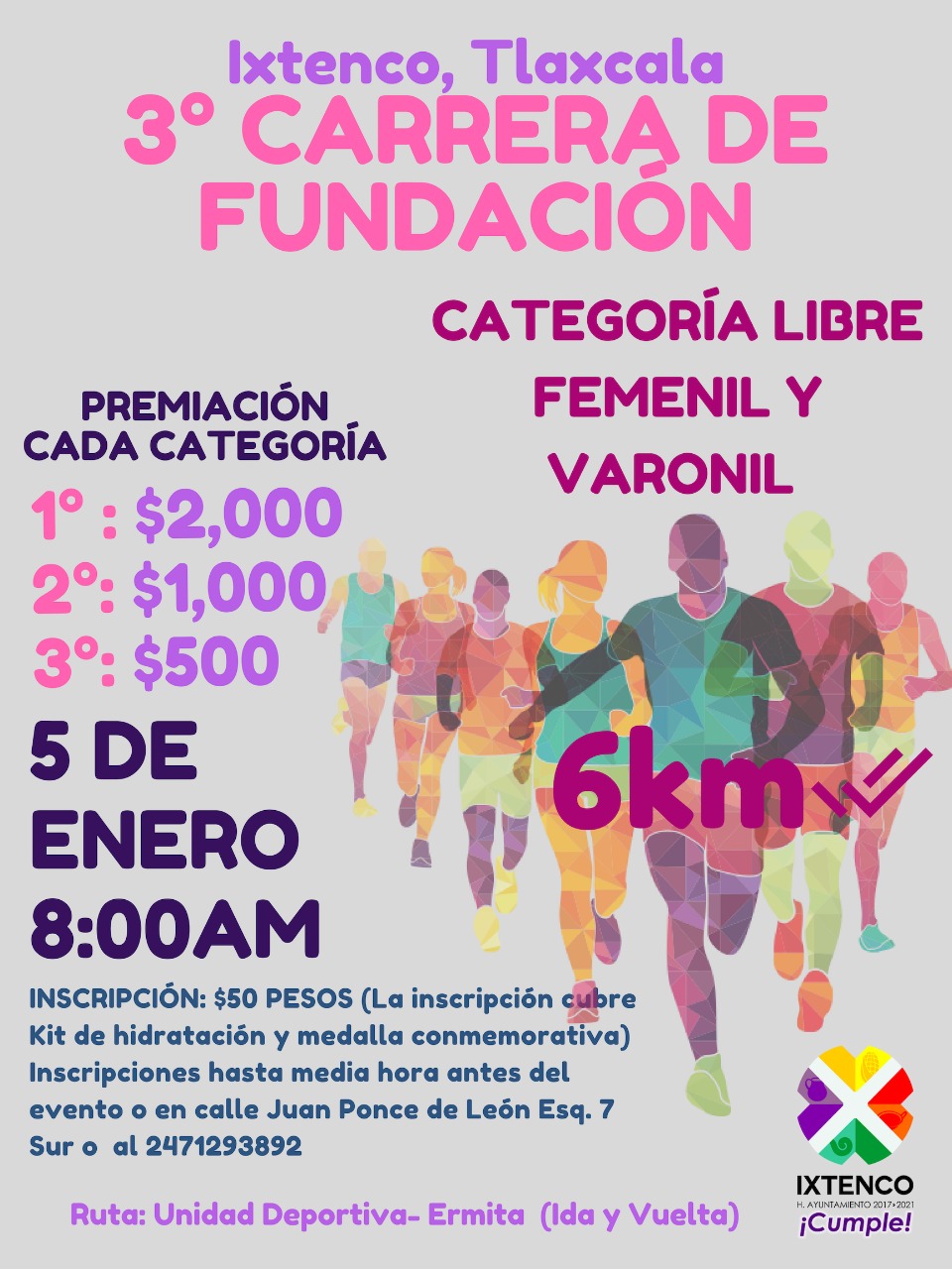 El Ayuntamiento de Ixtenco, que encabeza Miguel Ángel Caballero Yonca, anunció que como parte de los festejos de fundación del 487 aniversario de este pueblo otomí, se han preparado diversos eventos, en los que destaca la ya tradicional carrera de fundación.