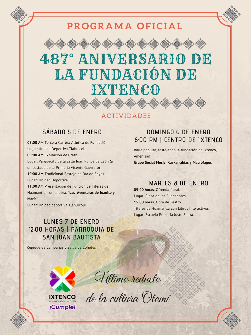 Como parte de las actividades del CDLXXXVII aniversario del último reducto de la cultura otomí, se tiene preparado un programa del 5 al 7 de enero, en donde destaca la realización de la tercera edición de la carrera de fundación que se llevará a cabo el 5 de enero a las 8 horas en la unidad deportiva Tlahuicole.