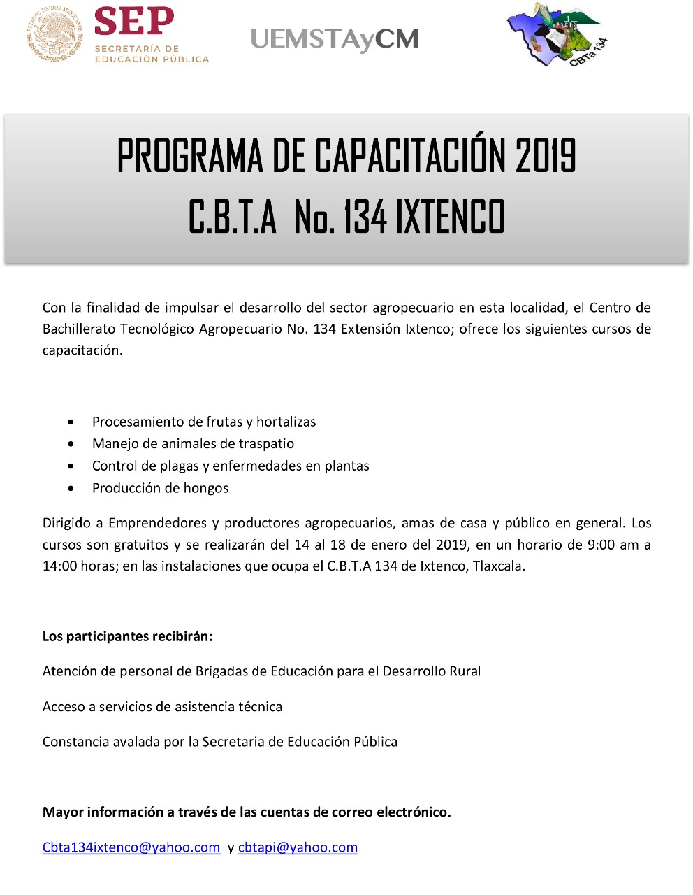 Estos cursos se llevaran a cabo del 14 al 18 de enero del 2019, en un horario de 9:00 am a 14:00 horas; en las instalaciones que ocupa el C.B.T.A 134 de Ixtenco, Tlaxcala, los participantes recibirán Atención de personal de Brigadas de Educación para el Desarrollo Rural, Acceso a servicios de asistencia técnica y Constancia avalada por la Secretaria de Educación Pública.