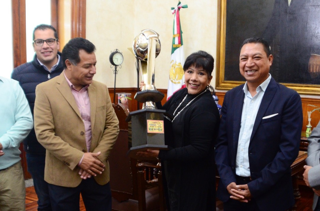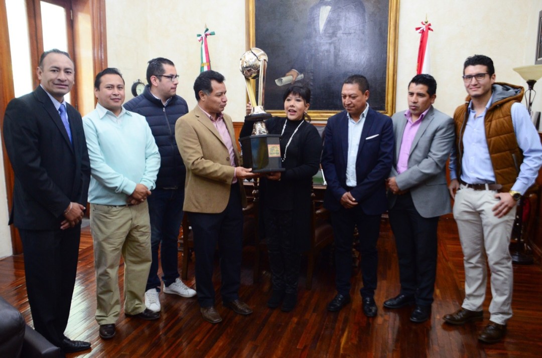 La presidenta municipal de Tlaxcala, Anabell Ávalos Zempoalteca, recibió este lunes de manos de los integrantes del equipo de Futbol 7, el trofeo obtenido tras haberse coronado como campeones del torneo de servidores públicos del Estado de Tlaxcala, al vencer a su similar de El Sol de Tlaxcala con un marcador de 4-1.