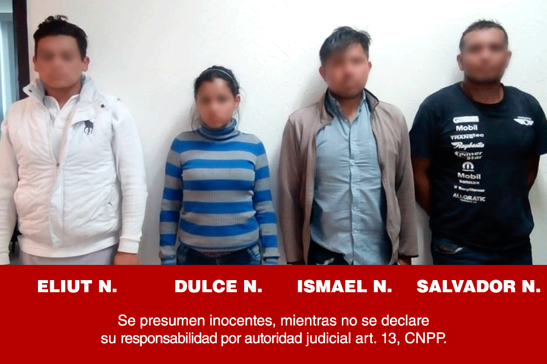 Por lo anterior, quienes se identificaron como Salvador N., de 38 años de edad, Ismael N., de 25, Dulce N., de 24 y Eliuth de 37 años, fueron asegurados y puestos a disposición del Agente del Ministerio Público por delitos contra la salud en su modalidad de narcomenudeo.