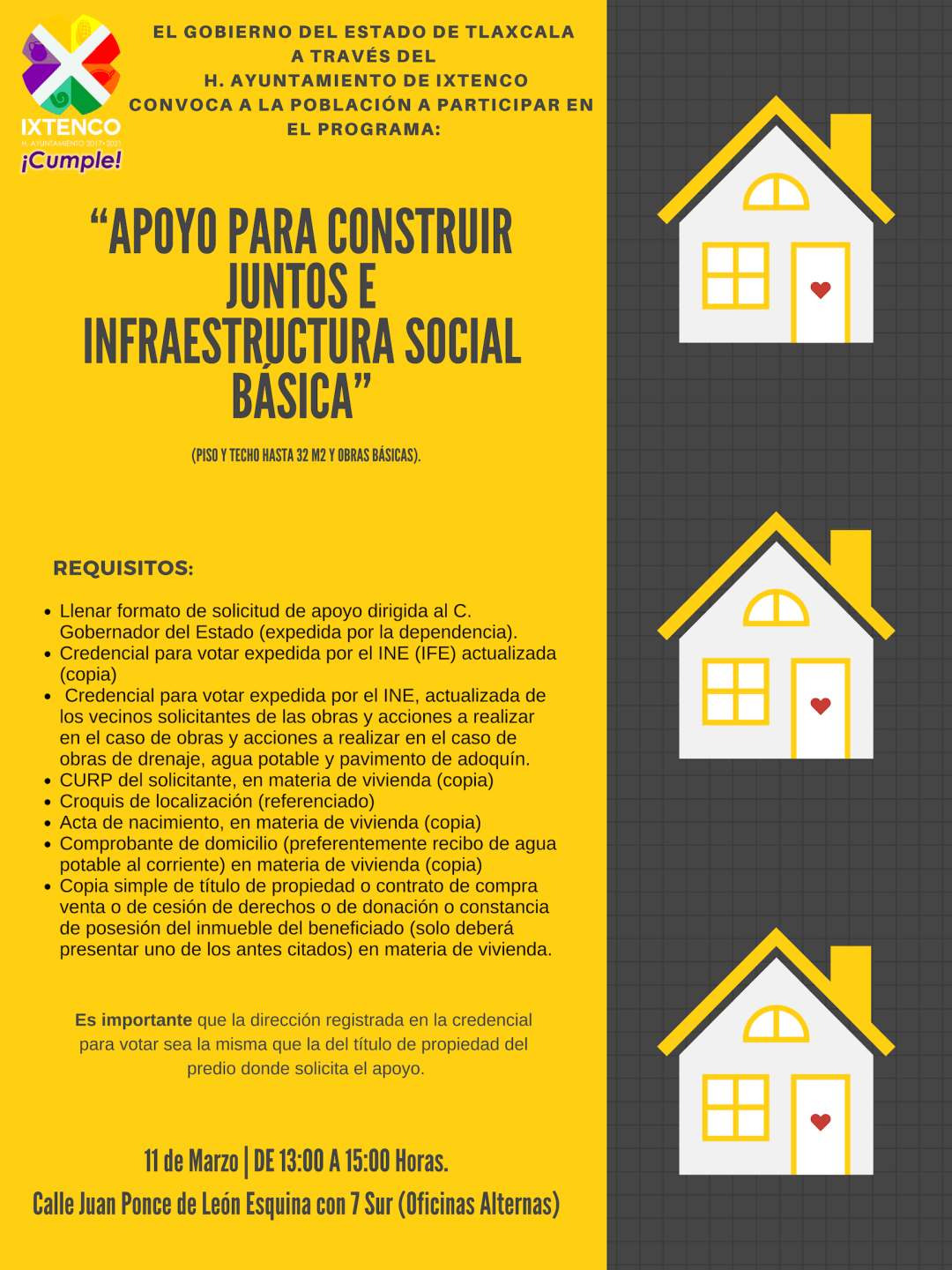 La cita es el próximo lunes 11 de marzo de 13 a 15 horas en las oficinas ubicadas en Juan Ponce de León esquina con 7 Sur, las personas podrán acceder a programas para la construcción de pisos y techos de hasta 32 metros cuadrados, además de otros apoyos de infraestructura social básica.
