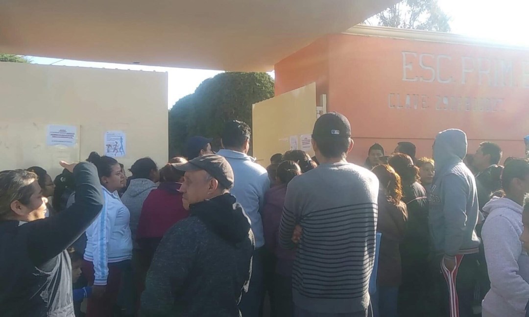 Padres de familia de la primaria Coyolxauhqui, ubicada en la localidad de Teotlalpan, municipio de La Magdalena Tlaltelulco, se manifestaron la mañana de este miércoles ante la restricción de los docentes para que los infantes reciban sus alimentos durante el receso.