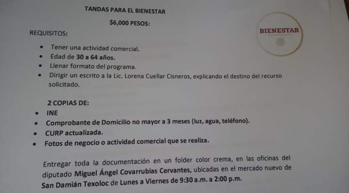 La distribución de los volantes aparentemente se realizó en el municipio de origen del diputado, Texoloc, en donde se ofrecen supuestos apoyos económicos denominados “Tandas para el bienestar” y Apoyos para niños y niñas”.