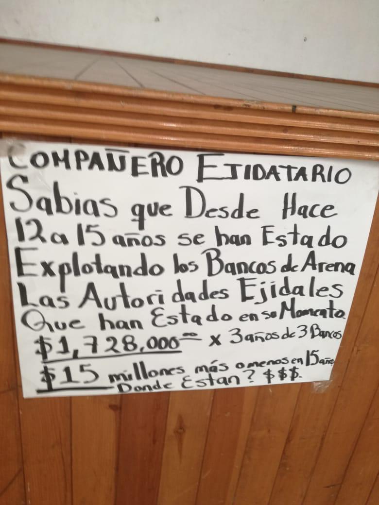 Por lo anterior, cientos de ejidatarios exigiron a Josefina Carpintero que diera la cara para aclarar los ingresos al comité por la venta de los bancos de arena y el comparativo del importe gastado durante su gestión.