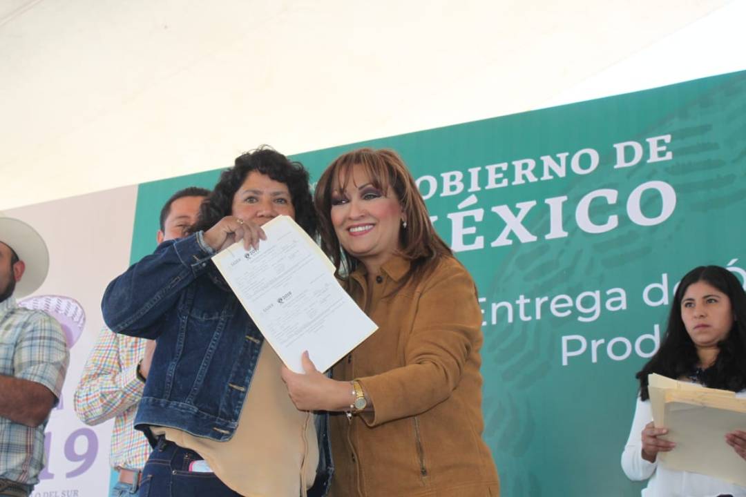 Entrega Lorena Cuéllar Cisneros, recursos del Programa Producción para el Bienestar en Calpulalpan.