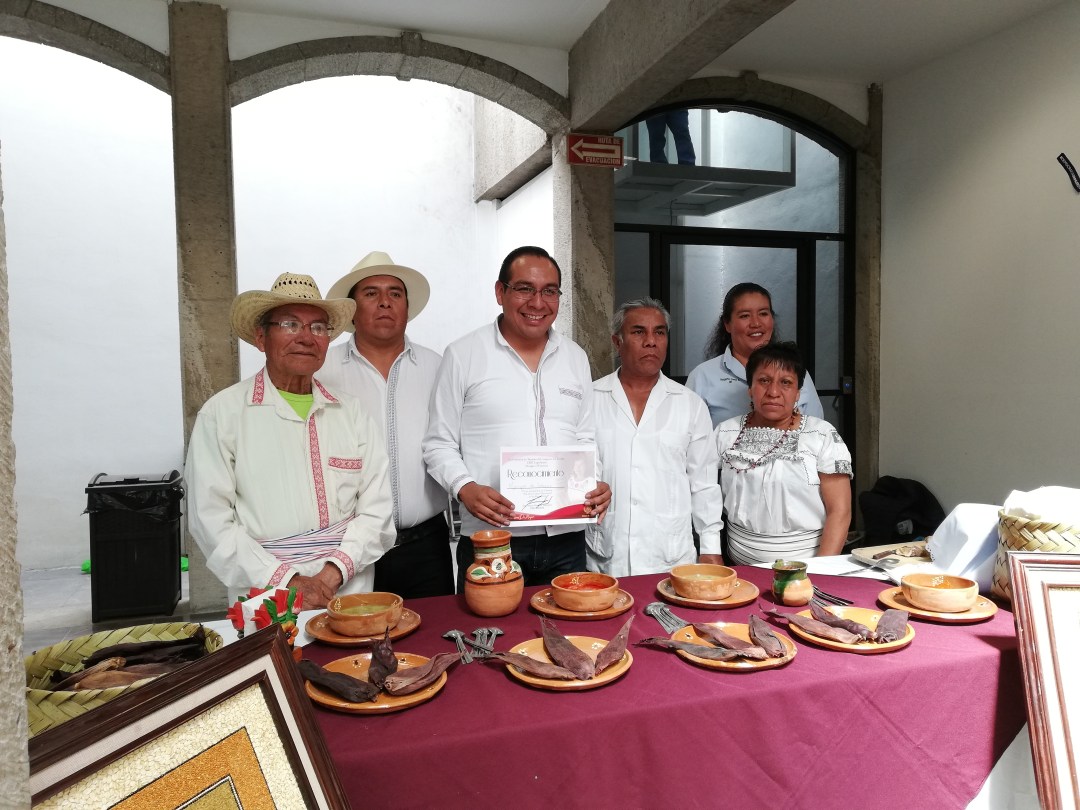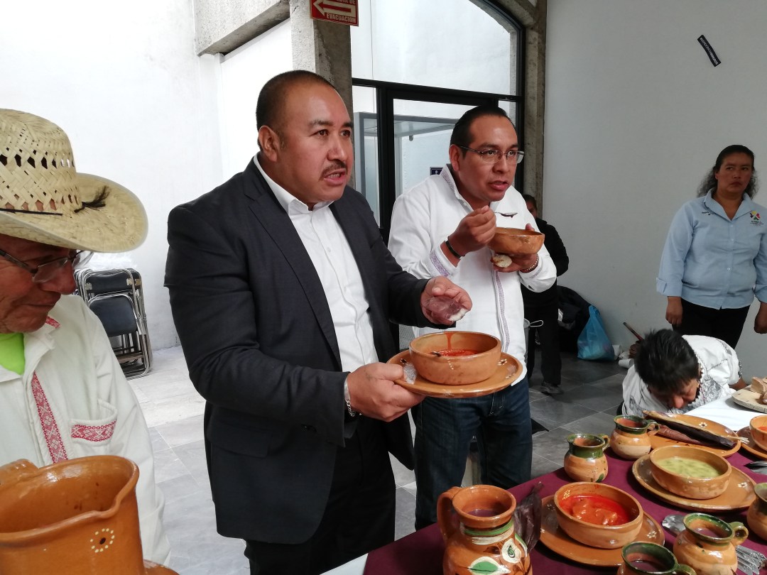 El alcalde de Ixtenco, Miguel Ángel Caballero Yonca, llevó una representación del pueblo Otomí, con cuatro de sus platillos más icónicos.