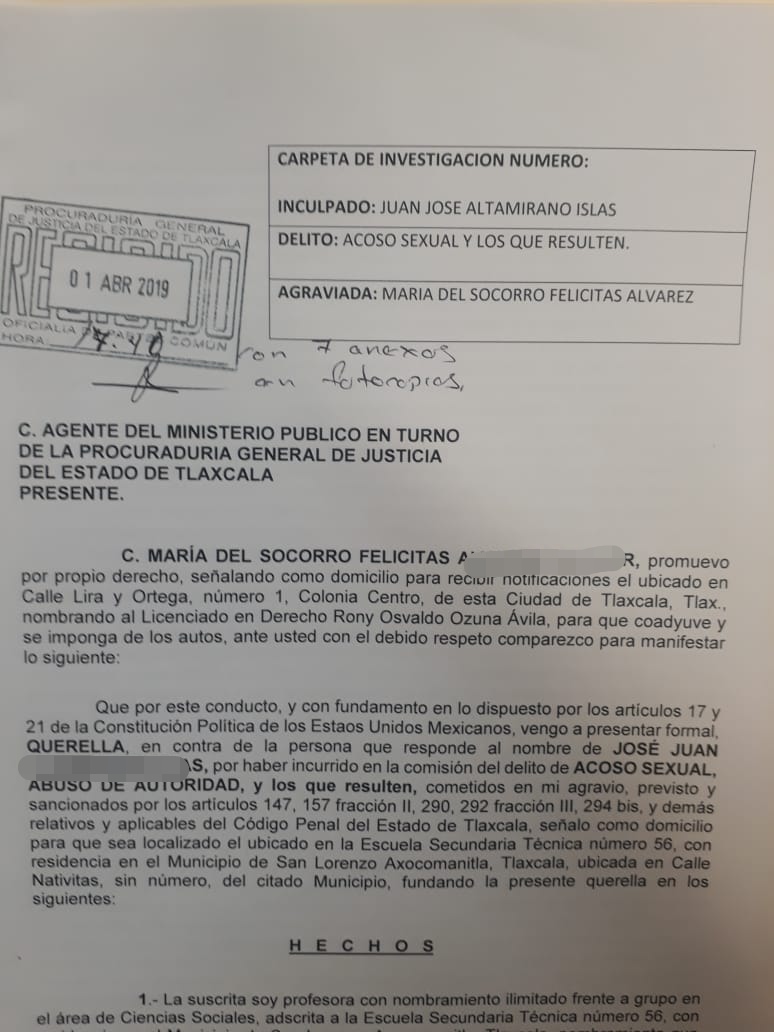 La maestra, María del Socorro N., denunció al director de la escuela Secundaria Técnica número 56, ubicada Axocomanitla, Tlaxcala, José Juan N., por incurrir en presuntos actos de violencia institucional, laboral y acoso sexual.