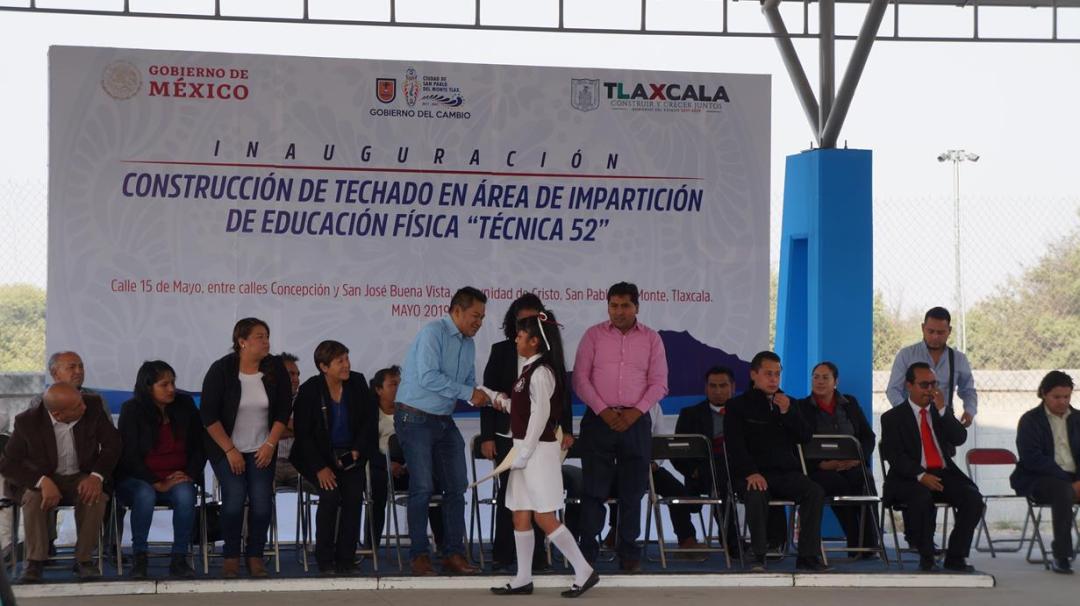 El presidente municipal, Cutberto Benito Cano Coyotl, acompañado del Honorable Cabildo, hicieron entrega del “Techado para el área de impartición de educación física” en la escuela “Técnica 52, Capitán Mariano Cantor” en la comunidad de El Cristo este miércoles 8 de mayo del año en curso.