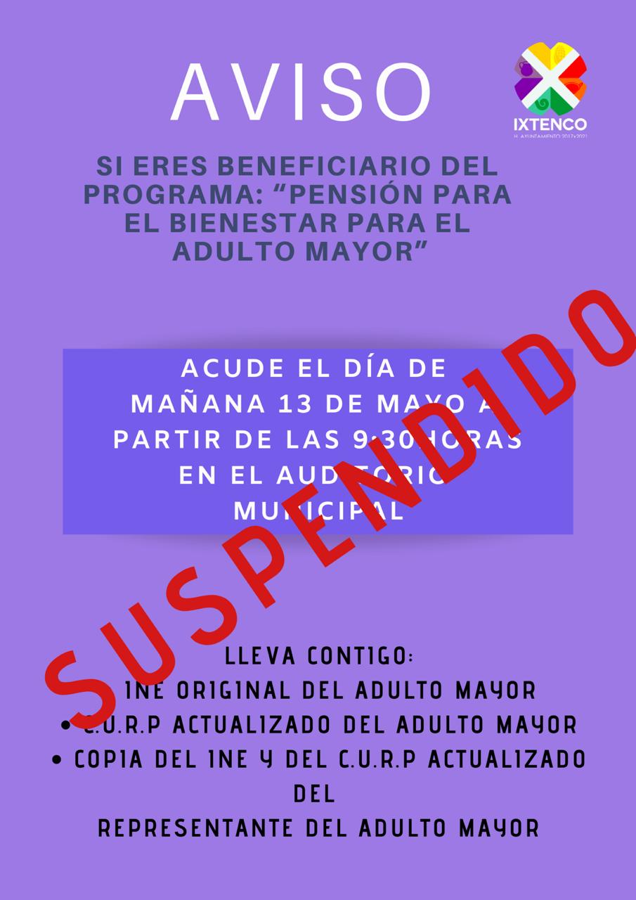 El Gobierno Municipal de Ixtenco que encabeza Miguel Ángel Caballero Yonca anunció que tras los recientes hechos en la comuna, las actividades para la transición de cobros de la pensión del adulto mayor serán suspendidas hasta nuevo aviso.