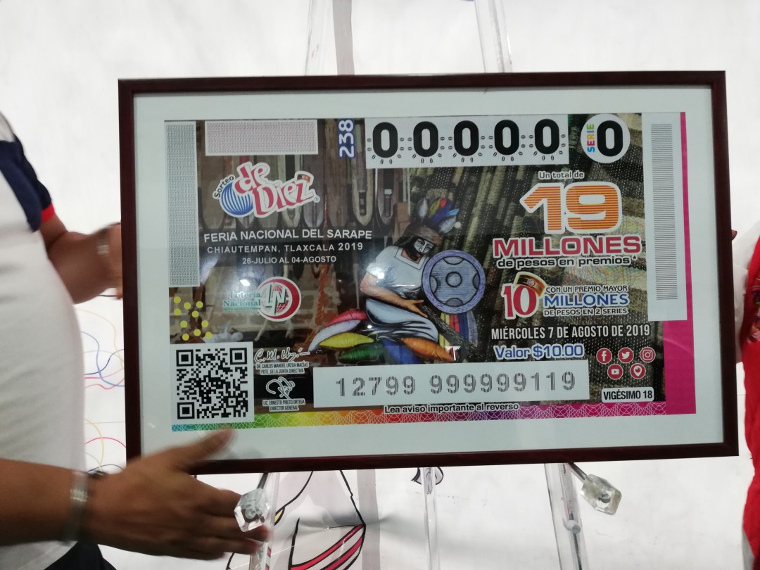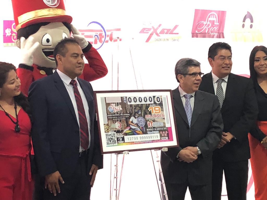 Durante la 42 edición de la Feria Nacional del Sarape Chiautempan 2019, el presidente municipal, Héctor Domínguez Rugerio, en conjunto con el representante de la Lotería Nacional, realizaron la develación del billete conmemorativo al festejo.