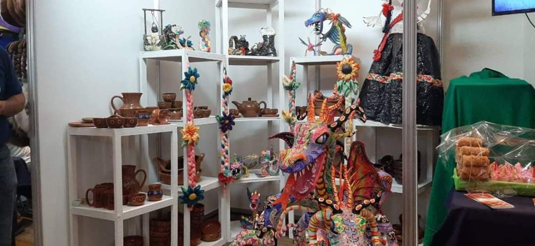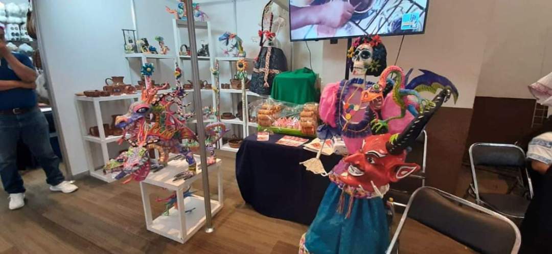El alcalde acudió acompañado por su esposa, la Presidenta Honorífica del SMDIF, Georgina Beatriz Luna Sánchez, así como los artesanos que exhibieron los multicolores alebrijes de Popocatla, las Cazuelas de Tenexyecac, así como máscaras de barro bruñido.