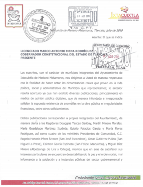 Se trata de la síndico, dos regidores y 16 presidentes de comunidad, quienes dirigieron el escrito al gobernador, Marco Antonio Mena, para alertarlo de la situación que prevalece en Ixtacuixtla, a causa de cinco regidores y cuatro presidentes de comunidad, quienes han realizado acusaciones de manera infundada hacia la administración municipal, vertidas principalmente en medios de comunicación.