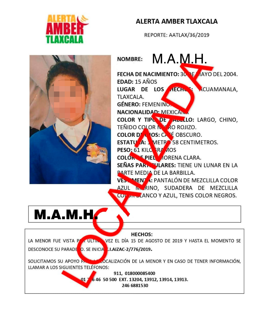 Lo anterior, luego que se informara que la menor fue vista por última vez el 15 de agosto del año en curso, cuando salió de su domicilio ubicado en el municipio de Acuamanala.