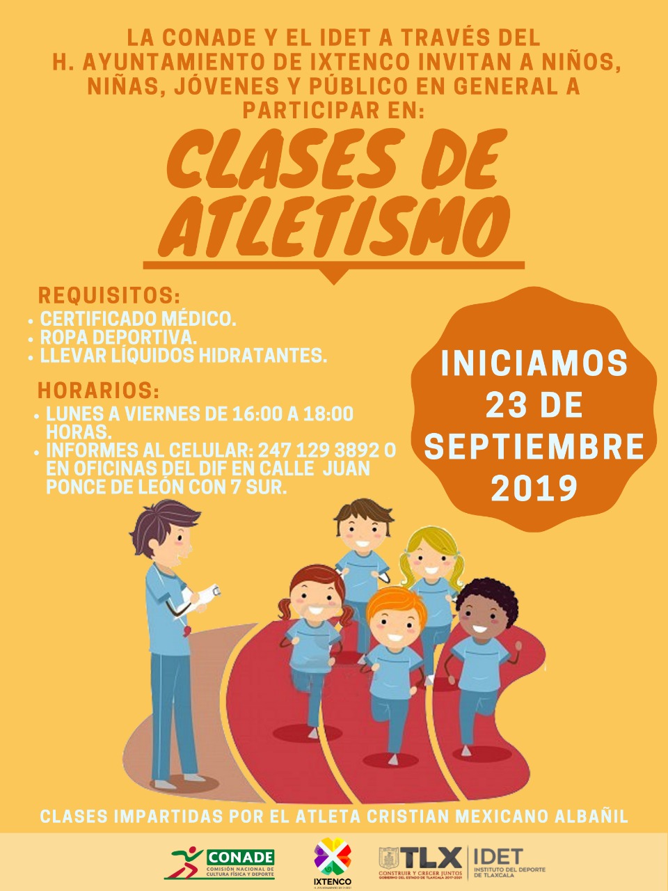 La CONADE y el IDET a través del Gobierno Municipal de Ixtenco que encabeza Miguel Ángel Caballero Yonca, invitan a todos los niños, niñas jóvenes y público en general a participar en las clases de atletismo para conformar la escuela Municipal de esta rama deportiva.
