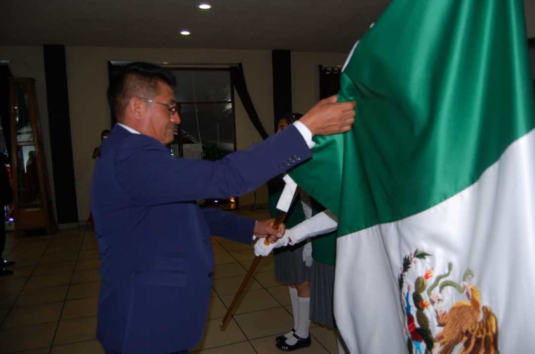 La escolta de la Escuela Secundaria Técnica No. 42 fue la encargada de entregar el lábaro patrio al alcalde, quien estuvo acompañado por su esposa, Pilar Pérez Luna, sus hijos e integrantes del ayuntamiento.