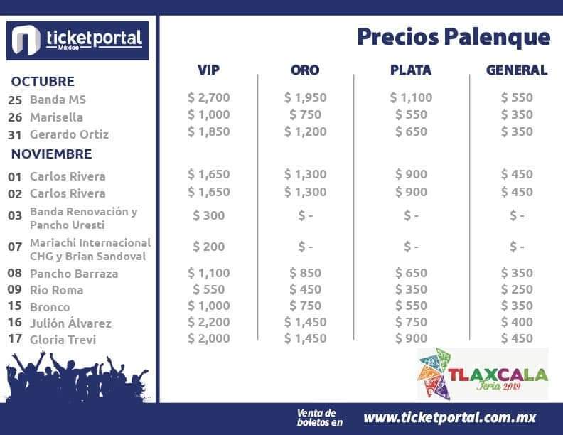 El costo de acceso al Palenque de la Feria Tlaxcala 2019 registró un incremento de casi el 10 por ciento con relación al año pasado, con precios desde los 250 pesos general, hasta los dos mil 700 pesos para la zona VIP.